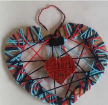 Tynnwch lun galon serch fach ar gardfwrdd, lliwiwch hi a’i thorri allan. Gallwch ysgrifennu neges ar y galon fach o dymunwch, ei hongian i lawr canol eich dyluniad ar y galon serch fawr a’u cysylltu gyda gwlân a’u glynu gyda thâp.